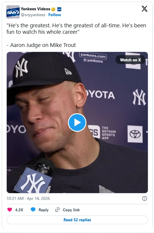 Trout’s success in NYC, and overall for his illustrious career, is not lost on Judge. Following his club’s much-needed win, which snapped a five-game losing streak, the Yankee captain heaped some high praise Trout’s way. Judge even went so far as to label Trout “the greatest of all-time.”